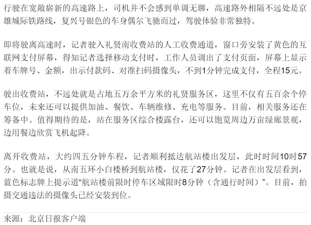 9月25日,《北京日報客戶端》在“去大興機場之高速路體驗:27分鐘,南五環(huán)直達航站樓”新聞報道中提到:“能“預(yù)報”行駛時間的標(biāo)志牌,首次應(yīng)用的主動發(fā)光交通標(biāo)志,加裝了掃碼區(qū)的人工收費窗口,可遠(yuǎn)程遙控的智慧路燈.......”,"與其它高速不同的是,大興機場高速會“報時”。沿線數(shù)十塊藍(lán)色的交通標(biāo)志牌上,距離大興機場公里數(shù)下方的LED顯示屏上提示著所需時間。工作人員介紹,這些指路標(biāo)志牌接入了地圖軟件的交通流量大數(shù)據(jù),可為駕車市民提供“時間距離”參考。此外,這些指路牌本身也不簡單,在夜間或低能見度天氣條件下,可以自動開啟發(fā)光模式,不再需要借助車輛燈光照射,這種指路牌在北京是首次應(yīng)用"。