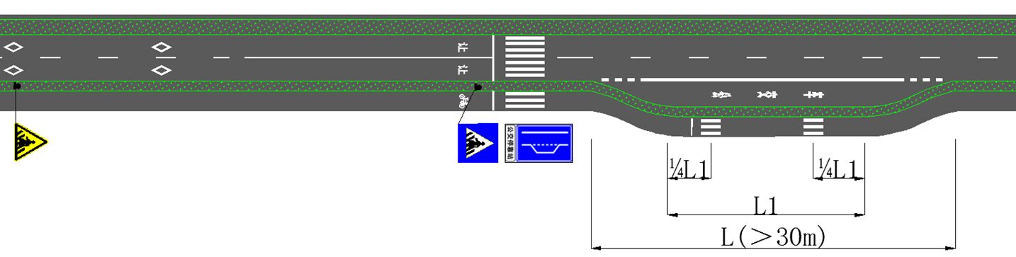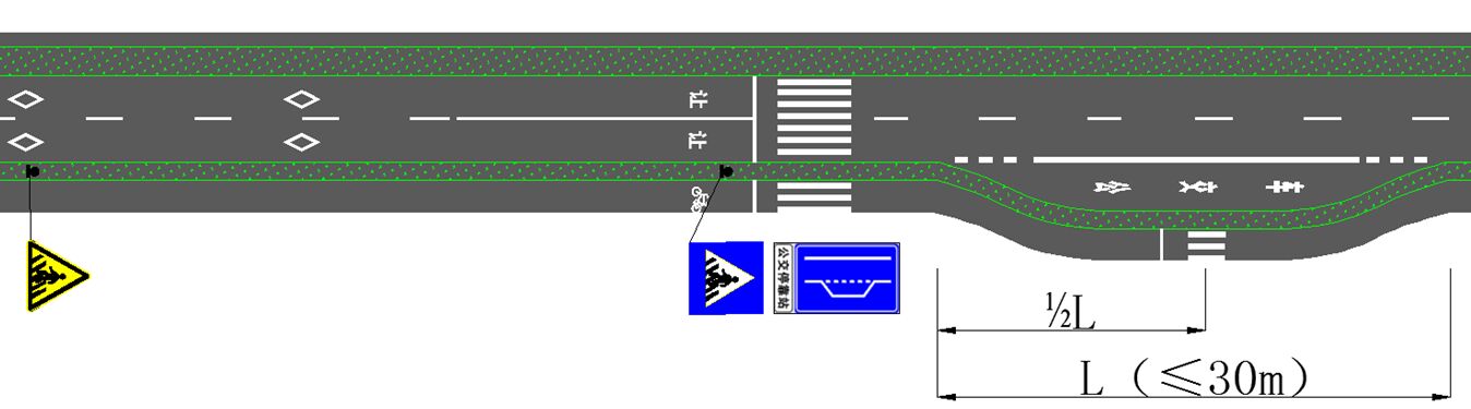 其中,站臺(tái)長度≤30米的,站臺(tái)1/2處設(shè)置一道3米寬度人行橫道線,詳見下圖;