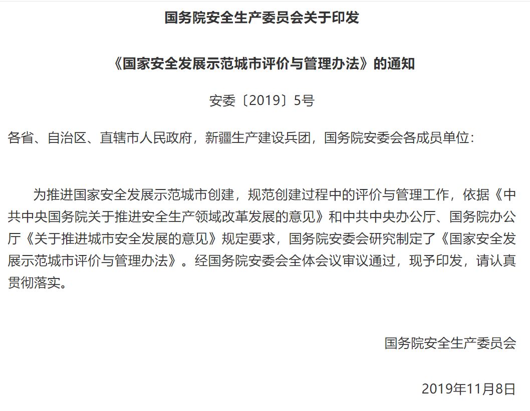 為推進(jìn)國家安全發(fā)展示范城市創(chuàng)建,規(guī)范創(chuàng)建過程中的評價(jià)與管理工作,11月8日,國務(wù)院安全生產(chǎn)委員會,向各省、自治區(qū)、直轄市人民政府,新疆生產(chǎn)建設(shè)兵團(tuán),國務(wù)院安委會各成員單位印發(fā)了《國家安全發(fā)展示范城市評價(jià)與管理辦法》(以下簡稱“評價(jià)辦法”)的通知。