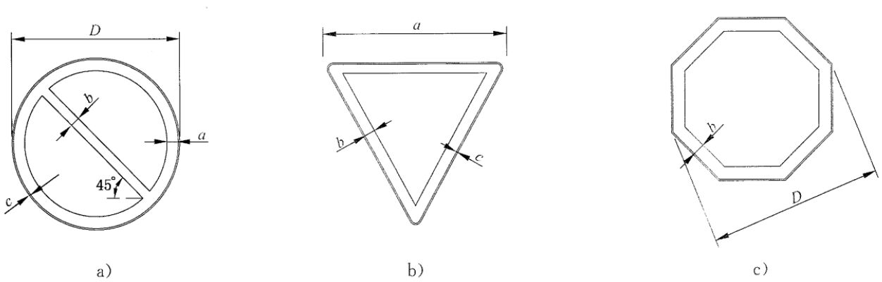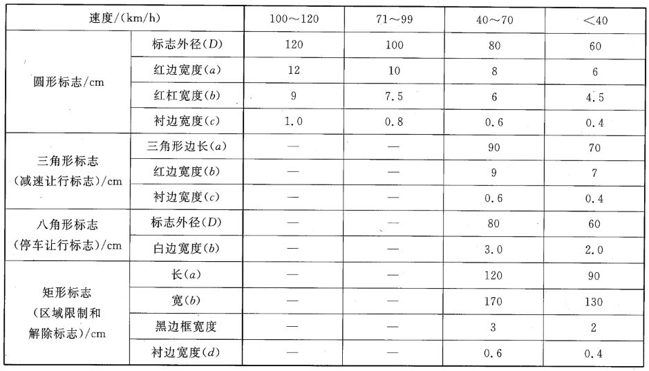 依據(jù)國(guó)標(biāo)《道路交通標(biāo)志和標(biāo)線》(GB5768.2)中所列圖案,除部分特殊標(biāo)志,常見(jiàn)的禁令標(biāo)志為圓型,紅色邊框、黑色斜杠。警告類(lèi)標(biāo)志,具體尺寸大小根據(jù)道路設(shè)計(jì)時(shí)速而定,通常有直徑60cm、80cm、100cm、120cm等四種。參考依據(jù)如下圖所示。
