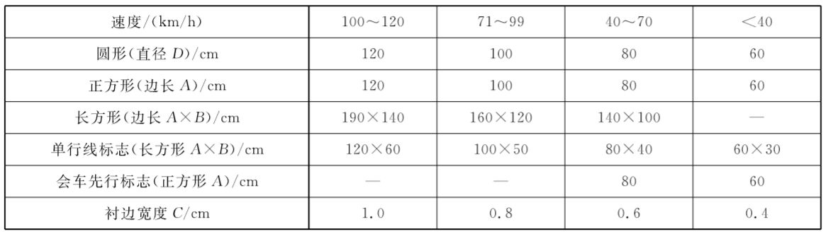 國(guó)標(biāo)《道路交通標(biāo)志和標(biāo)線》(GB5768.2)中明確規(guī)定:指示類(lèi)標(biāo)志,通常反光膜顏色為藍(lán)色、白色配色;其各部分的一般值應(yīng)根據(jù)道路設(shè)計(jì)時(shí)速而定,常見(jiàn)的小型指示標(biāo)志有:彎道誘導(dǎo)標(biāo)志(線型誘導(dǎo)標(biāo)志)、路名指示標(biāo)志、車(chē)道行駛標(biāo)志等。參考依據(jù)如下圖所示。