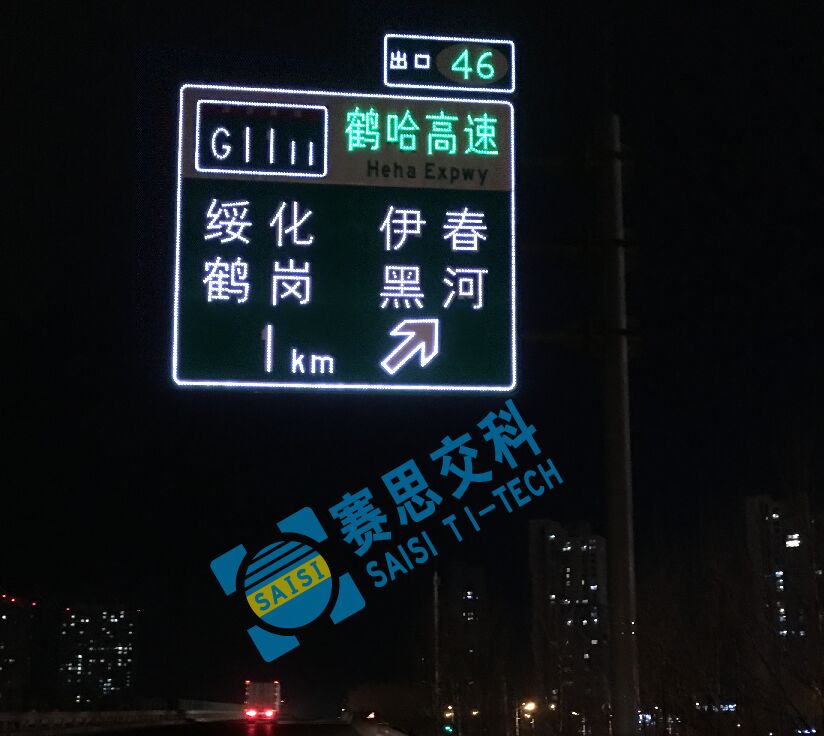 “大型指路類點陣型主動發(fā)光標志”,其標志版面中圖案、文字、數(shù)字、字母、邊線等外嵌高亮LED發(fā)光管,并通過調(diào)光測試軟件,將LED發(fā)光管合理布點,并設(shè)置合理的發(fā)光強度,形成由點光源組成的面光源視認效果,實現(xiàn)標志牌能主動發(fā)光的功能特性,滿足人眼正常、和諧的視覺捕捉及視認效果。