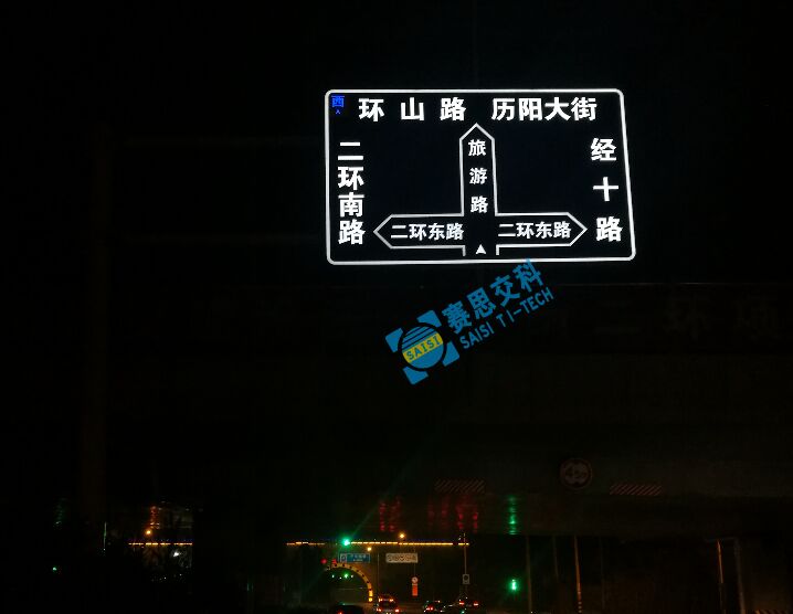 指路標志,作為道路路名、關鍵交通節(jié)點的重要指示信息載體,通常設置于道路交叉口進口方向,對前方交叉口的相交路名信息、遠點信息進行提前的預告,便于司機及時獲取關聯(lián)道路信息,及時修正駕駛方向,實現準確達到目的地的行車目標。所以指路標志具備遠距離辨認性、全天候視認性、和在交叉口易發(fā)現性顯得尤其重要,設計師在選用半透式主動發(fā)光標志,正是出于以上的特殊功能性。