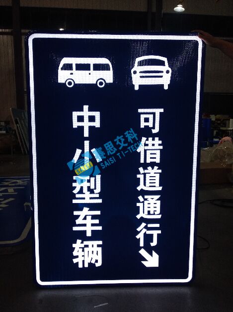指示標志,通常包括:路名(地點)確認標志、道路功能指示標志(如:車道行駛標志)、道路屬性標志(如:非機動車道標志)、行駛方向指示標志(如:右下行駛標志)等。該類標志通常版面尺寸較小,但所載信息重要關鍵。在城市道路中,到處充斥著各種廣告標志、宣傳標志、店名標志等,指示標志在其中,常常不易被發(fā)現,運用半透式主動發(fā)光標志,使該類標志主動發(fā)光,在夜晚或光照不佳的環(huán)境中,能主動發(fā)光標志,極易被捕捉發(fā)現,這是交通安全設計師非常看重的特殊化功能優(yōu)勢。