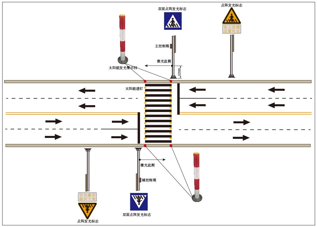 本智能行人過街預(yù)警系統(tǒng),主要包括:激光雷達(dá)監(jiān)測設(shè)備、人行橫道發(fā)光指示標(biāo)志(雙面)、注意行人發(fā)光警告標(biāo)志(輔標(biāo)"有人過街、注意禮讓")、語音播報(bào)器、太陽能發(fā)光警示柱、太陽能發(fā)光道釘、無線數(shù)據(jù)傳輸模塊、總控制系統(tǒng)(含軟件)等。