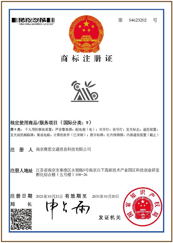 我司(賽思交科)的新“公司LOGO(商標(biāo))”已于2021年10月21日通過(guò)國(guó)家知識(shí)產(chǎn)權(quán)局成功審核,并獲得商標(biāo)注冊(cè)證(證書編號(hào):第54623202號(hào)),有效期至2031年10月20日,有效期10年。如下圖: