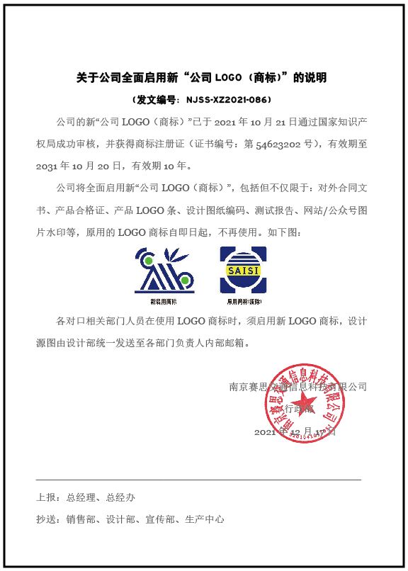 公司將全面啟用新“公司LOGO(商標(biāo))”,包括但不僅限于:對(duì)外合同文書、產(chǎn)品合格證、產(chǎn)品LOGO條、設(shè)計(jì)圖紙編碼、測(cè)試報(bào)告、網(wǎng)站/公眾號(hào)圖片水印等,原用的LOGO商標(biāo)自即日起,不再使用。