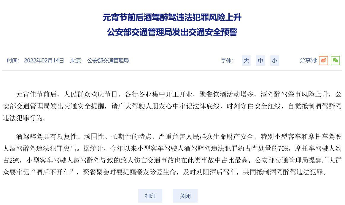 明天就是元宵節(jié),春節(jié)年假最長的企業(yè)單位、個體工商戶,也將陸續(xù)開工開業(yè),出現(xiàn)扎堆的聚餐團聚活動,按以往經(jīng)驗,元宵節(jié)前后,酒駕醉駕等肇事風險明顯上升。為此,公安部交通管理局于2022年2月14日,特別發(fā)文《元宵節(jié)前后酒駕醉駕違法犯罪風險上升,公安部交通管理局發(fā)出交通安全預(yù)警》,旨在提醒廣大駕駛?cè)伺笥研闹欣斡浄傻拙€,時刻守住安全紅線,自覺抵制酒駕醉駕違法犯罪行為。