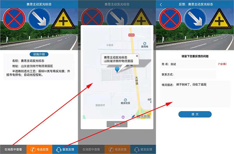 手機掃描二維碼后打開設(shè)施設(shè)備詳情頁面,可看到當(dāng)前設(shè)施設(shè)備的詳細資料,可通過地圖查看當(dāng)前位置,也可通過撥打電話、留言反饋等方式向后臺反映問題。不僅方便了公眾查詢自己當(dāng)前位置及相關(guān)情況,也方便設(shè)施設(shè)備維護機構(gòu)對出現(xiàn)問題的設(shè)施設(shè)備進行及時維護。