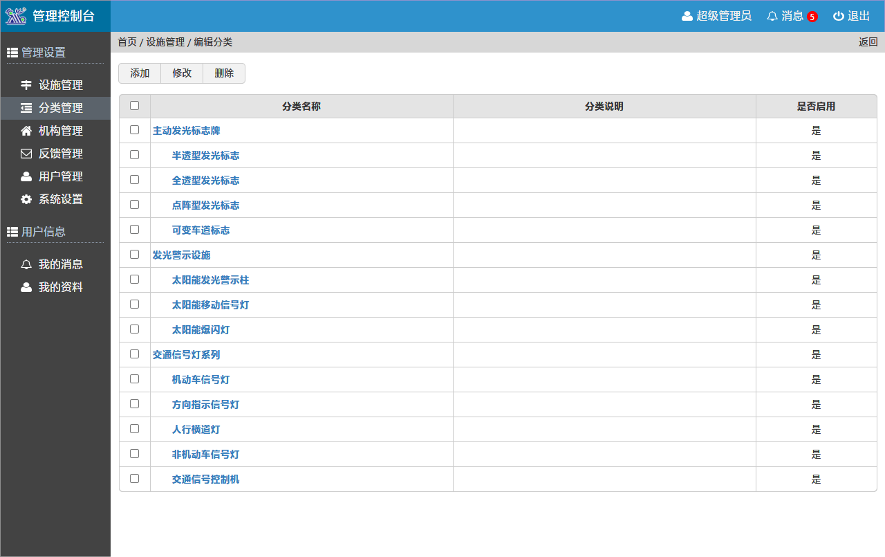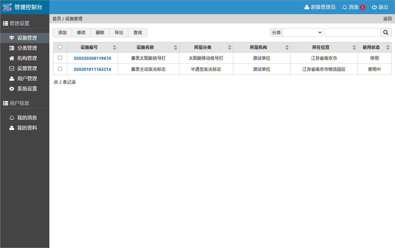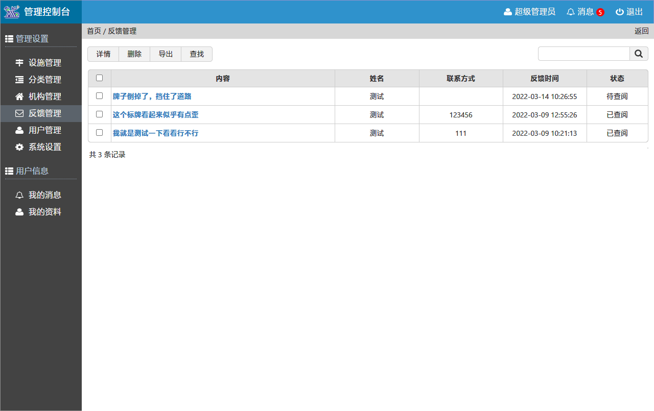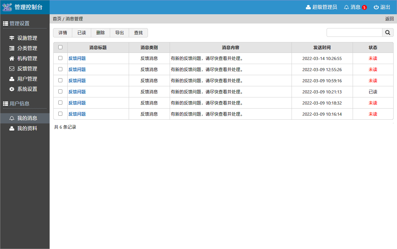 設(shè)施管理系統(tǒng)擁有完善的后臺管理功能,可按列表添加設(shè)施設(shè)備,可按層級添加分類、機構(gòu)??梢蕴砑佣鄠€管理用戶,并設(shè)置不同管理權(quán)限。當(dāng)收到反饋信息后,能及時顯示新消息數(shù)量。在反饋管理模塊中,可查看當(dāng)前反饋的信息列表,及時處理對應(yīng)問題。