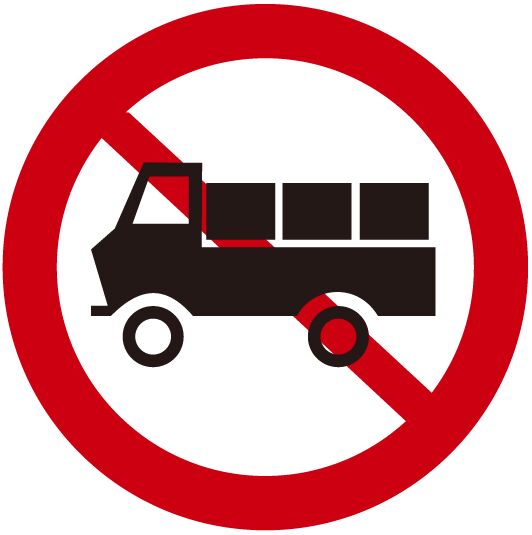司機小柳每次幫我們送貨,都會問是不是禁區(qū),他說:“新到一個地方,我們哪里熟悉路況!常常導航顯示出口下來不遠,就到了,可快臨近時,信號燈桿上卻掛著“禁貨標志”,明明地方比較偏,卻是限貨;或者目的地不限貨,而我們卻不知道在一群限貨路段,如何繞到那里!“只知道哪里不能走!卻不知道哪里能走!”所以,大概率只能掉頭,找個偏的地方,等到夜里11點后再送過去!”我告訴他,以前只有“禁止貨車”禁令標志,沒有就能走!基本就是“排除法”,現在,國標《道路交通標志和標線》(GB5768.2~2022版)中,已明確給出了“貨車通行”指示標志圖案(下圖右),看見這個標志,就是專門讓你們行走的路段,逐漸地,各個地區(qū)都會規(guī)劃出“物流線”,并設置這款標志,這樣就更清晰了。
