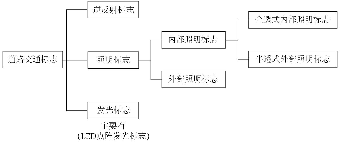 要了解主動(dòng)發(fā)光標(biāo)志,首先須了解它的大致分類(lèi)和名稱。依據(jù)國(guó)標(biāo)《道路交通標(biāo)志和標(biāo)線 之 第2部分 道路交通標(biāo)志》(GB 5768.2~2022版)之4.2.4條分類(lèi)定義,“道路交通標(biāo)志按光學(xué)特性分類(lèi),分為逆反射標(biāo)志、照明標(biāo)志和發(fā)光標(biāo)志,其中照明標(biāo)志按光源安裝位置又分為內(nèi)部照明標(biāo)志和外部照明標(biāo)志”。其中“逆反射標(biāo)志”,就是常說(shuō)的“非光源類(lèi)”反光膜標(biāo)志牌,僅依賴于反光膜的逆反射功能來(lái)實(shí)現(xiàn)標(biāo)志牌受光后的反光效果;如果把“內(nèi)部照明標(biāo)志”按照發(fā)光面積與整版面積的占比度,再繼續(xù)拆分出子概念,就目前市場(chǎng)可見(jiàn),內(nèi)部照明標(biāo)志又分為“全透式內(nèi)部照明標(biāo)志”和“半透式內(nèi)部照明標(biāo)志”。其中“發(fā)光標(biāo)志”,國(guó)標(biāo)沒(méi)有明確給出定義和概念的內(nèi)涵,但從其分類(lèi)上來(lái)思考,大致可以知道其劃分的依據(jù):逆反射標(biāo)志——自身沒(méi)有發(fā)光光源;照明標(biāo)志——標(biāo)志面板外,或標(biāo)志內(nèi)部有光源;剩下的“發(fā)光標(biāo)志”該如何定義?從概念的外延上,采用逐一排除法,剩下的就是“標(biāo)志面板上有光源”這一類(lèi),其產(chǎn)品主要有、但不僅限于“LED點(diǎn)陣發(fā)光標(biāo)志”,其分類(lèi)層次圖大致如下。