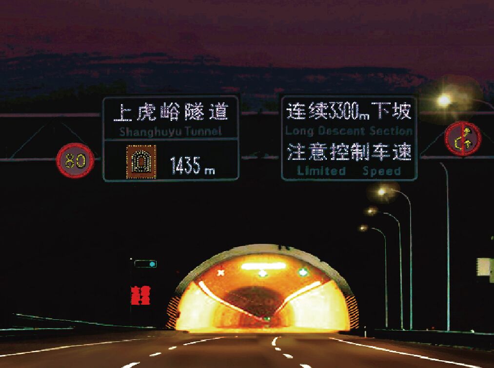 因此,在有條件的情況下,隧道及進出路段所有交通標志均宜采用Ⅴ類大廣角反光膜,或者采用主動發(fā)光型交通標志,以提升交通標志的遠距離、大角度、全天候視認功能,并通過科學、合理地增設基礎交通安全設施,消除特殊交通環(huán)境所衍生的安全隱患,提高隧道內行車安全、秩序和通行效率,降低交通事故發(fā)生率,保證整個運輸系統(tǒng)的健康運行。