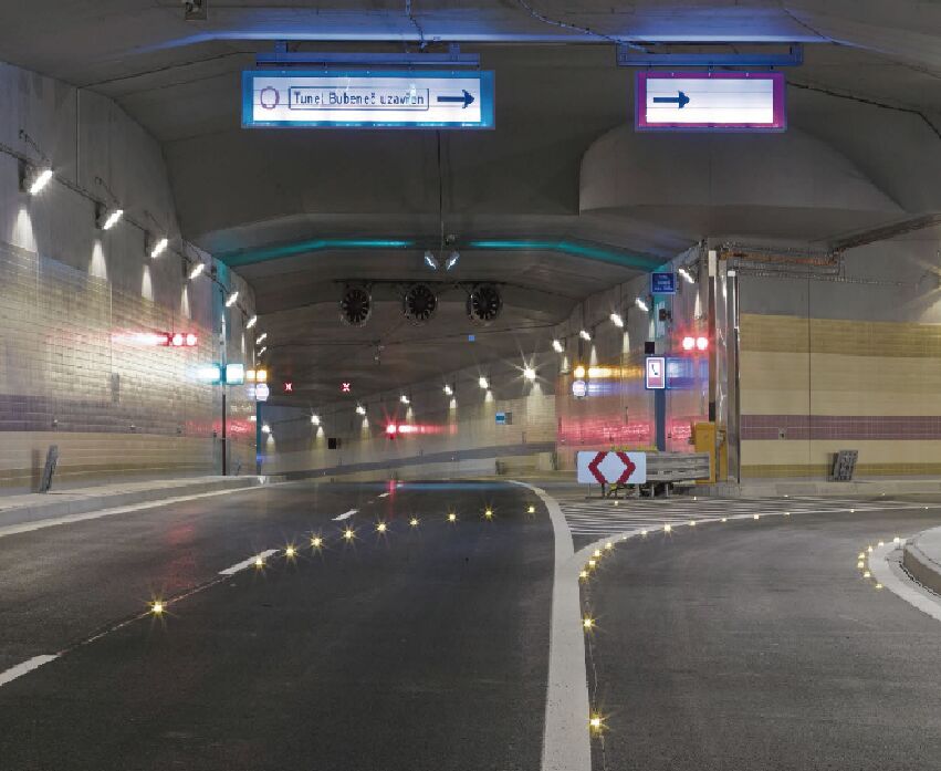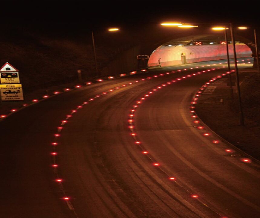 3、對于彎曲隧道路段應設置必要的視線誘導設施,如主動發(fā)光誘導設施等 。在隧道車道中心線以及兩側邊緣線上分別設置黃色與白色被動反光道釘,隧道兩壁附著主動發(fā)光輪廓標,提示駕駛人對向車道以及隧道墻壁的真實位置,消除緊張心理。