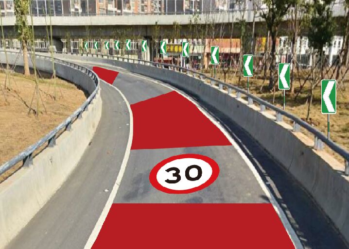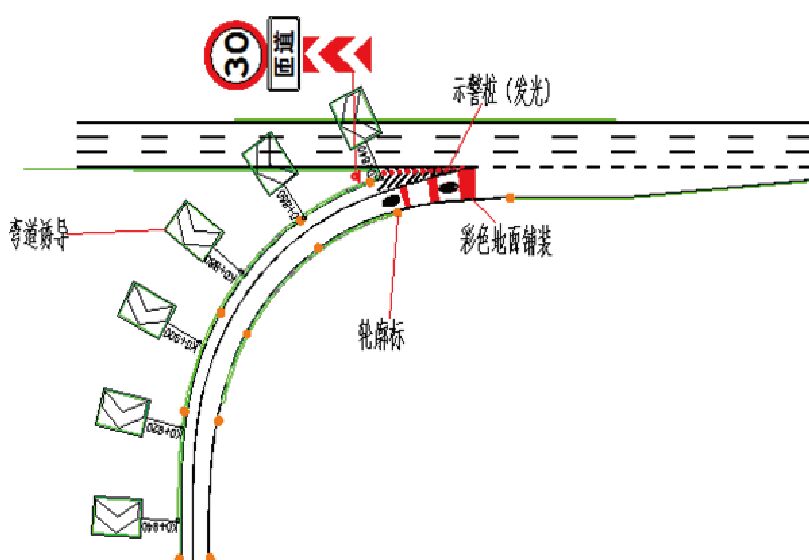 在道路彎道處,設(shè)置輪廓標、彎道誘導(dǎo)標志、道口標、發(fā)光警示柱、彩色防滑路面鋪裝和限速標志標線等。根據(jù)彎道的分類和彎道的實際情況,選擇相應(yīng)的交通安全設(shè)施,以保障道路彎道處行車安全,降低交通事故發(fā)生率,保障路網(wǎng)通行暢通,提升城市形象。具體的設(shè)置情況如右圖所示: