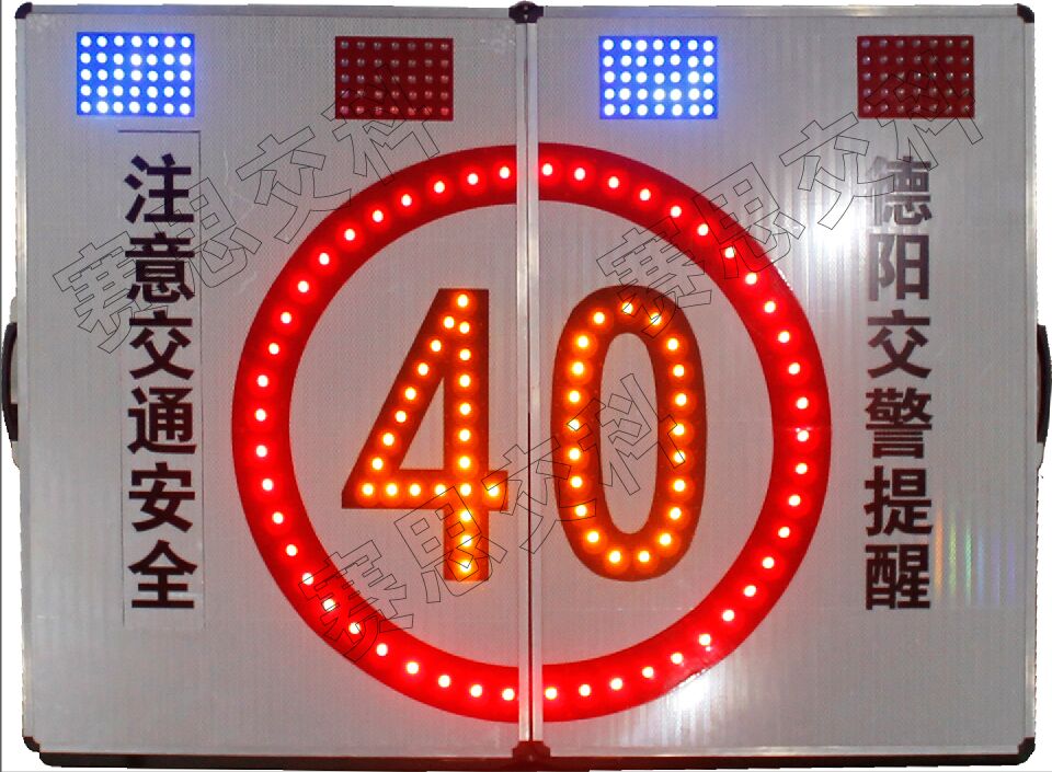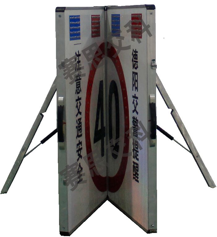 2、標(biāo)志版面設(shè)置LED發(fā)光限速標(biāo)志圖案,上置2組(紅爆閃燈+藍(lán)爆閃燈),兩邊設(shè)置交通警示標(biāo)語或管制單位。標(biāo)志整體展開后,配置支撐架,放置于管理路段,標(biāo)志閉合時(shí),配有手提把,警員可輕松提攜,方便、便攜。